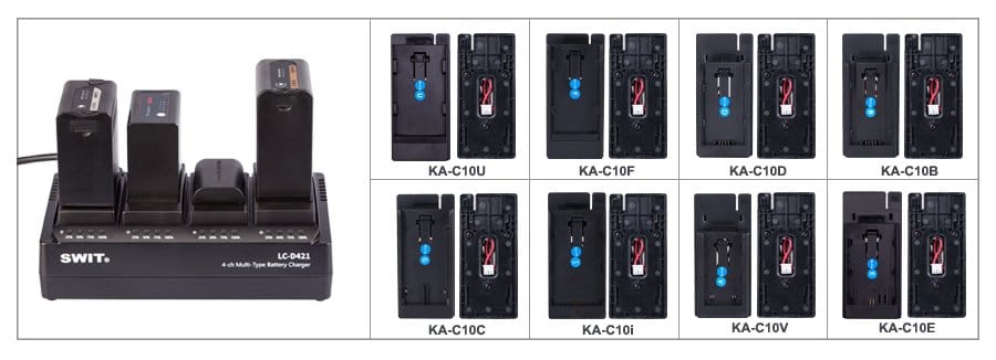 4-kanálová nabíjačka SWIT LC-D421 pre rôzne druhy batérií s napätím 7,2V a 14,4V. Nabíjačka umožňuje nabíjanie batérií rôznych typov a od rôznych výrobcov súčasne ako SONY, Panasonic, JVC a Canon.