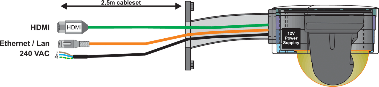 2,5 m kabelážou pre pripojenie k existujúcej infraštruktúre a disponuje konektormi HDMI, Ethernetovým rozhraním (RJ45/LAN) a PEN vodičom pre pevné pripojenie k 240V elektrickej sieti, a obsahuje zabudovaný 12V DC zdroj pre napájanie kamery.