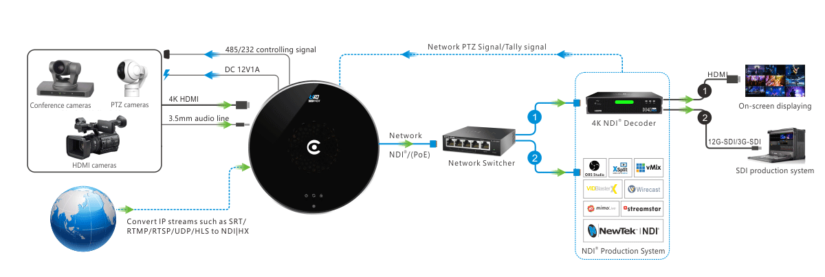 S plnou podporou NDI aj NDI|HX Kiloview U40 prevádza vaše 4K HDMI video na plnú NDI. S dvoma ethernetovými portmi navyše prevádza IP streamy ako RTSP, RTMP, SRT, TS-UDP, HLS na NDI|HX, čo robí vašu kameru viac výkonnou a univerzálnou.