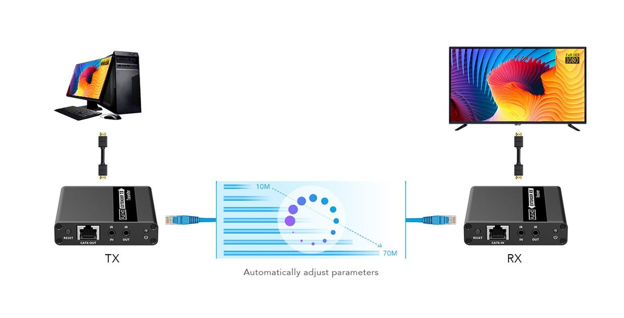 Tento HDMI Extender obsahuje vysielaciu jednotku a prijímaciu jednotku, umožňuje prenos signálu HDMI až na vzdialenosť 70 metrov pri rozlíšení 1920x1080p@60Hz pomocou sieťového kábla Cat6/6A/7. Prijíma konfiguráciu pripojenia bod-bod, podporuje KVM.